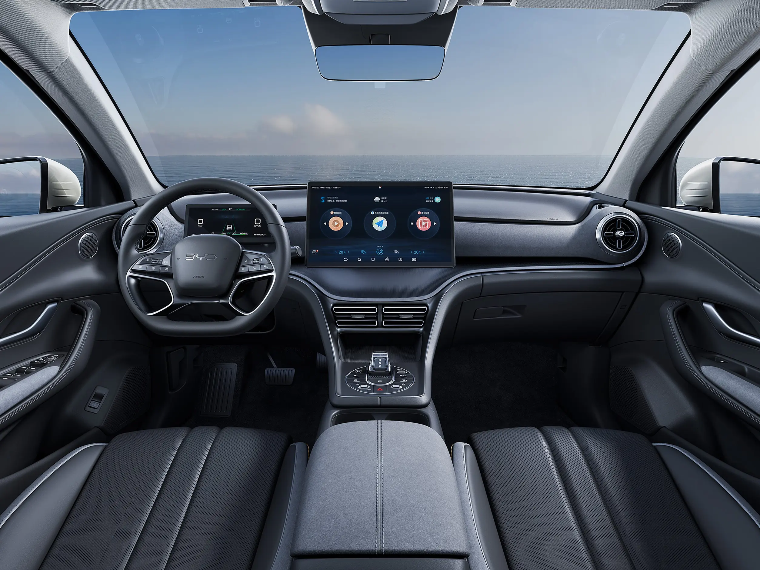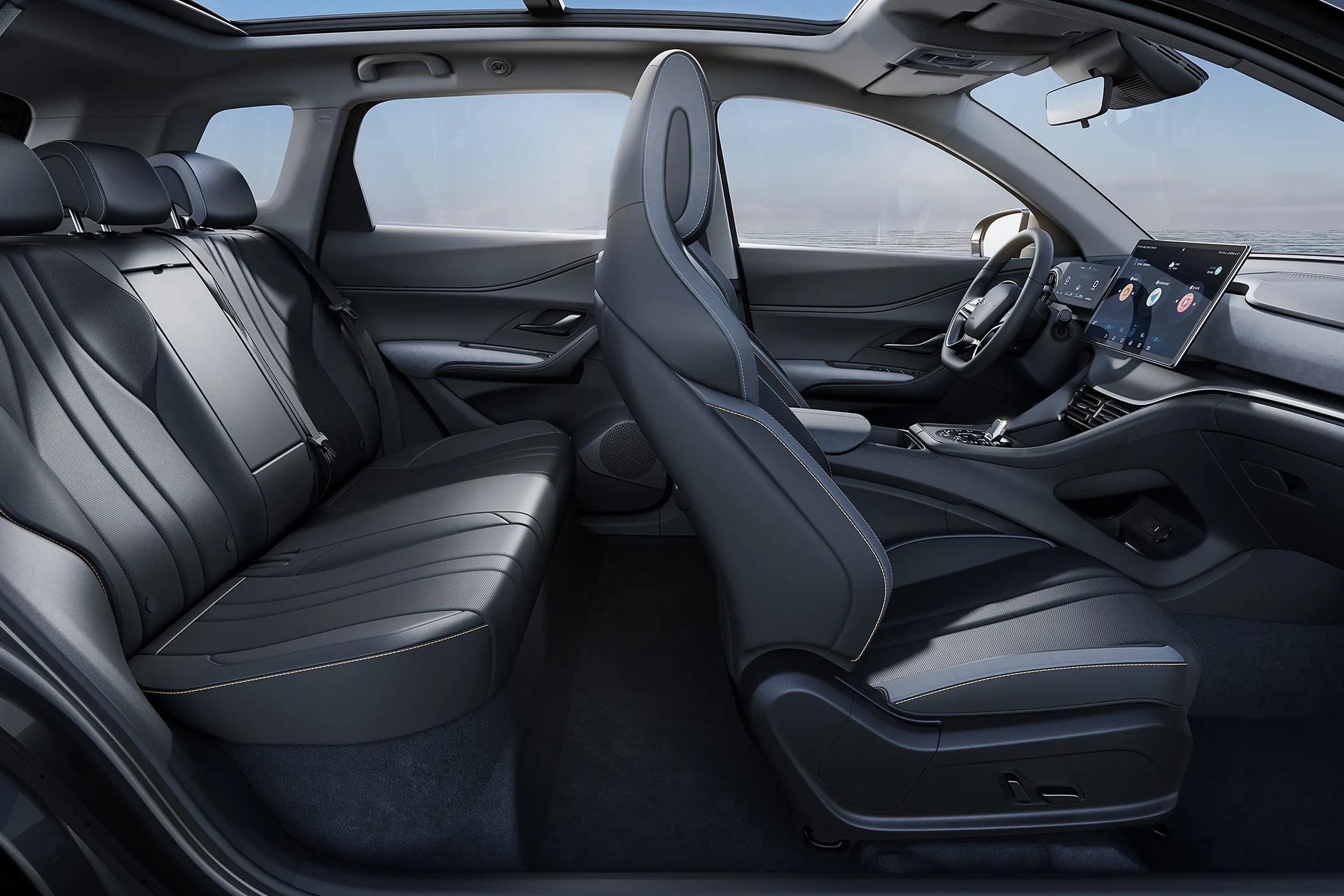 内饰方面,海狮05 DM-i采用环绕式海洋律动座舱和“海洋之芯” 中控布局,线条柔和,两端圆形空调出风口搭配镀铬装饰,搭配的四幅式方向盘运动感不错。该车配备8.8 英寸悬浮式仪表盘,根据车型配置不同,提供 8.8 英寸液晶仪表、12.8 英寸和 15.6 英寸的自适应悬浮式中控屏,搭载 DiLink 智能网联系统,车内空间表现良好,前排座椅一体式运动风格设计,高配版带加热、通风功能。