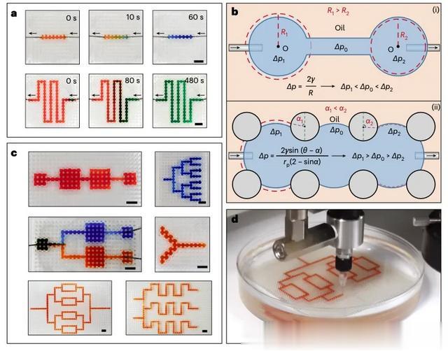 实现液体积木的第一步是创建和固定液体单元。本文打印了一个柱状基底,用于捕获液体单元。将10μl的水滴滴入在硅油中孵化的柱状基底,水滴被周围四根柱子截留,形成稳定的液体单元。通过不断向柱状基底中添加水滴,形成更多水单元,并最终连接成一个结构化的水通道。水通道的形成在很大程度上取决于基底材料的表面能。本文模拟了水通道中的薄水层(三个相连的水单元),以探索多单元液体结构生成过程。与单水单元相比,由于一些水油界面的结合(损失),水通道两端水单元承受了指向中心单元的额外压力。因此,两端的水单元倾向于流向中心单元。当水从末端单元流向中心单元时,中心单元的LP(Δp2)将小于末端单元的LP(Δp1),从而引发相连单元逆变,打破已形成的通道。相比之下,在稍疏水柱状基质中,会阻止连接单元进一步收缩,从而稳定水通道。此外,研究人员还研究了不同形状的柱子(三角形、菱形、正方形、五边形和六边形)。结果显示只有菱形支柱性能与圆形支柱相似。对于其他形状的支柱,在添加水滴或连接水单元时经常出现收缩。因此,在该系统中,基底材料的表面能、液体体积和柱状基底的几何形状共同决定液体单元的生成及其组合。通过这种方式,可以在几分钟内构建出具有多样化几何形状、组成和精心设计的液体-液体界面排列的2D和3D液体设备。