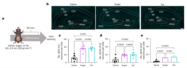 海马是记忆形成和储存的关键部位,在食物记忆线索和控制食物摄入中也发挥作用。有研究表明,在胃接收到食物之后,海马就会被激活。研究人员对野生型小鼠给予糖、脂肪或等渗盐水,发现了被糖或脂肪激活的海马神经元集中在背侧和腹侧海马(dHPC和vHPC),尤其是在齿状回和CA1区域。