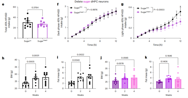 在高脂高糖饮食条件下,小鼠走向肥胖似乎是必然。如果在这种时候破坏糖反应性背侧海马神经元,与对照组相比,小鼠的总体食物摄入量不会发生变化,但是进食频率降低,体重和脂肪量保持稳定,显著低于对照组小鼠;破坏脂肪反应性神经元,小鼠10天内对高脂饮食的摄入量减少了60%,体重停止增加。