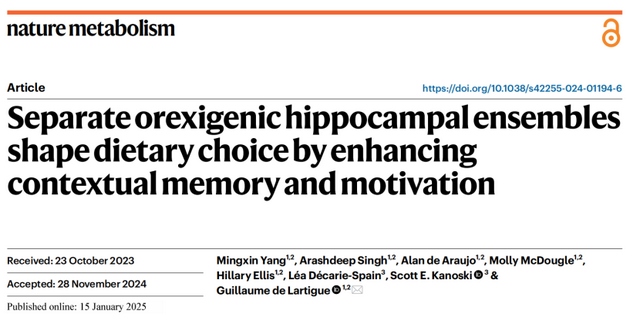 Yang M, Singh A, de Araujo A, et al. Separate orexigenic hippocampal ensembles shape dietary choice by enhancing contextual memory and motivation. Nat Metab. Published online January 15, 2025. doi:10.1038/s42255-024-01194-6