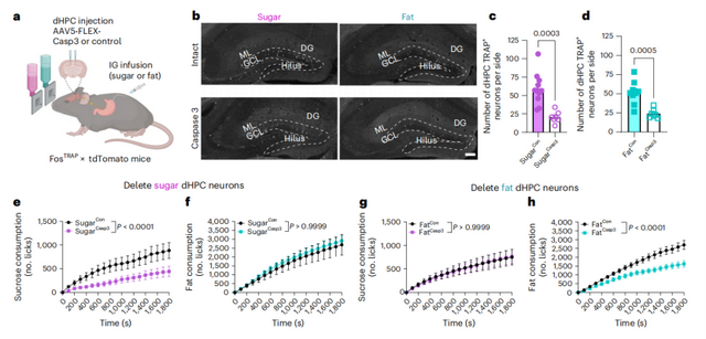 分别用糖或脂肪诱导海马神经元激活,研究人员发现,背侧海马中响应糖和脂肪摄入的神经元之间几乎没有重叠,并且这些激活的神经元与饱腹感神经元也不相同。选择性消融糖/脂肪反应性神经元,可以观察到小鼠对糖/脂肪的摄入减少了50%/40%,激活糖/脂肪反应性神经元则会增加小鼠对糖/脂肪的摄入。