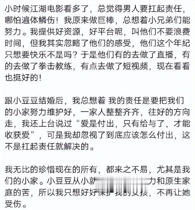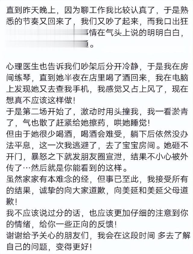 而且在道歉当中也没有解释自己在妻子孕期和其他女性暧昧的事,到底有没有这件事,又是和谁暧昧,到底是误会还是事实都没有说明,既然言语侮辱和家暴都给自己疯狂开脱,这件事找找借口是不是因为没法找借口了呢?