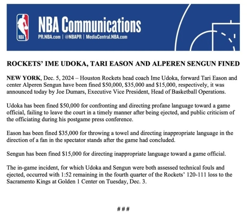 NBA官方宣布,火箭队主教练乌度卡、前锋伊森和中锋申京分别被罚款50000美元、35000美元和15000美元。