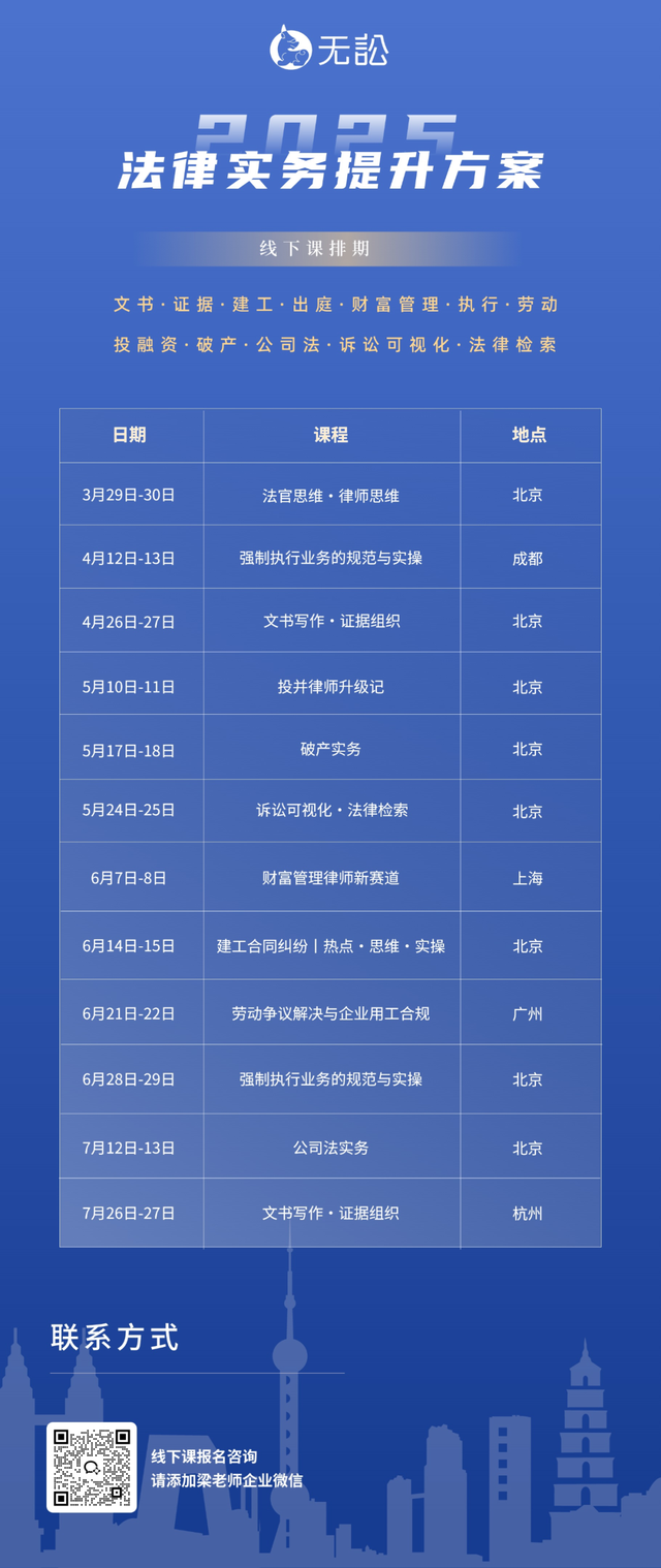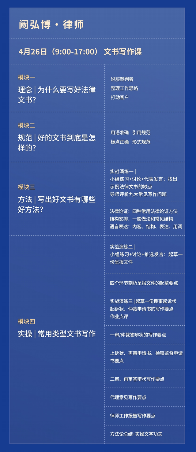 无论你是法律行业新兵,成长型律师,亦或是有内训需求的律所、公司法务部,一堂沿着一定思维路径组织证据、撰写合格法律文书和客户文书的核心技能课程,必定能满足你的要求。