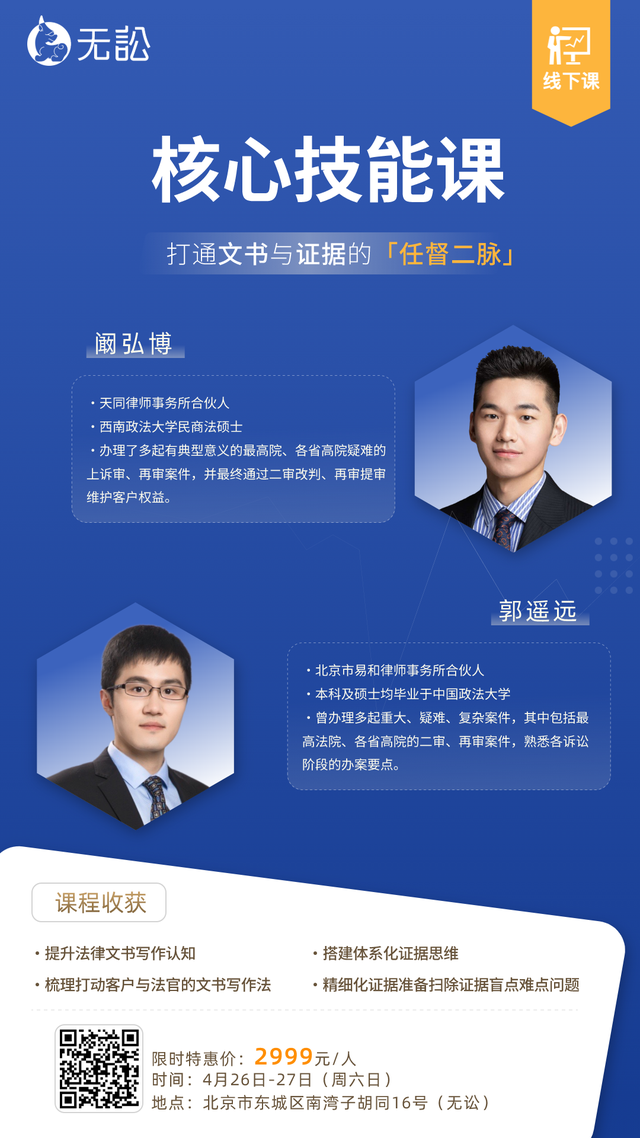 4月26日-27日,无讼第72期「文书写作」+「证据组织」面授课,邀请天同律师事务所合伙人阚弘博和北京市易和律师事务所合伙人郭遥远,带你从结构搭建到语言优化,打造逻辑清晰、说服力强的文书,学习如何高效收集、分类、筛选和呈现证据,形成强有力的支持链条。