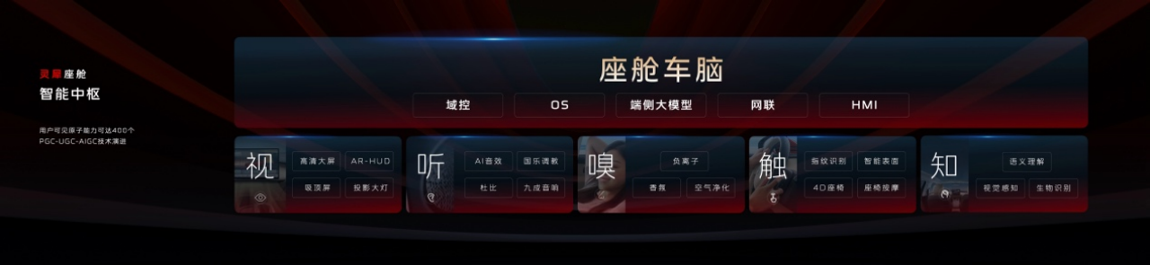灵犀座舱实现了真正的AI上车,充分融合“视听嗅触知”五觉体验,将上百类传感器和执行器的能力原子化,拓展全维服务模式,覆盖日常代步、停车休息、休闲娱乐全场景,座舱可化身咖啡馆、午睡间和KTV,提供情绪价值十足的主动个性服务。在红旗九章大模型加持下,灵犀座舱可以自动判断用户所处场景和需求,提供无感触发的一系列服务,仿佛心有灵犀,让科技预判你的心跳。