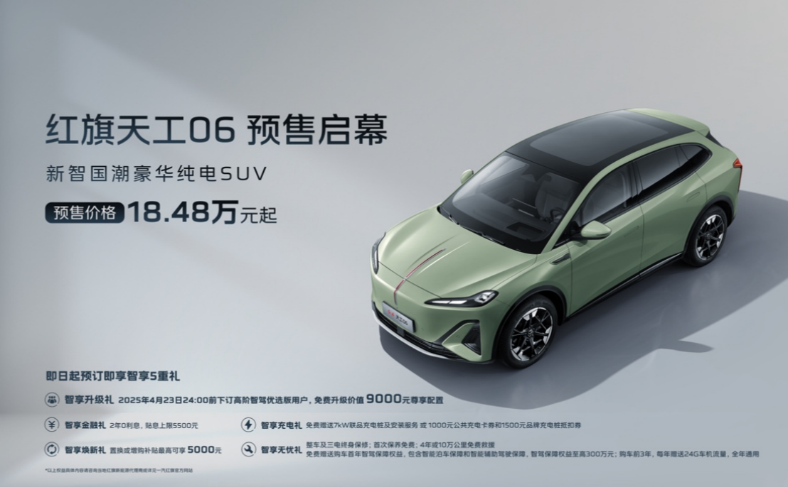 天工06定位新智国潮豪华纯电SUV,除搭载了与天工05相同的司南智驾系统和灵犀座舱外,还配备了专属超级适时智能四驱系统,拥有毫秒级的四驱介入响应,既可为用户提供卓越的四驱驾乘体验,又能让用户享受两驱的极低电耗。此次红旗品牌智能体验日天工06正式开启预售,预售价格18.48万元起,并带来丰厚的“智享五重礼”预订权益。