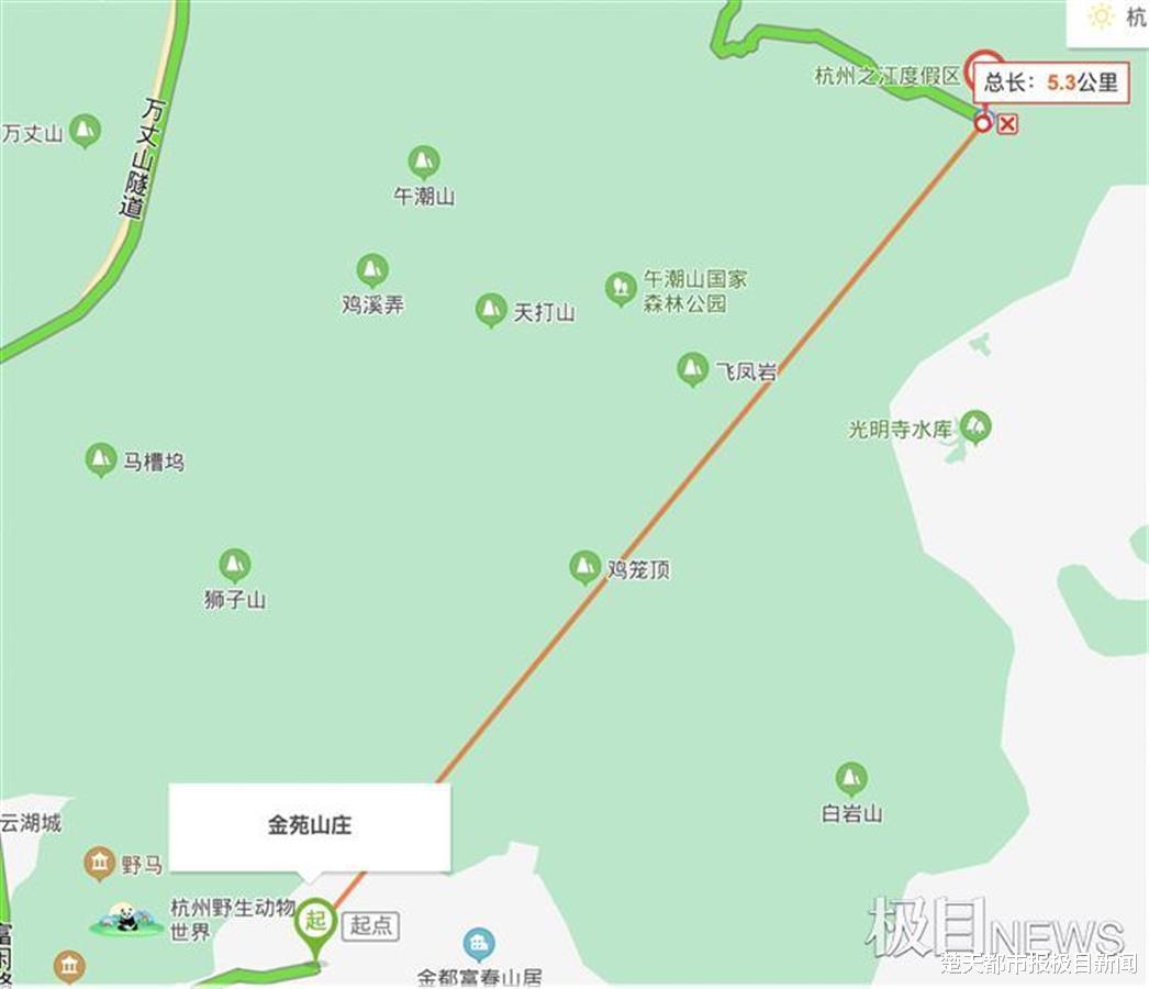 5月7日晚,金钱豹曾出现在金苑山庄。百度地图显示,豹子主题园区距离金苑山庄直线距离仅一公里,从杭州野生动物世界正门到金苑山庄距离为2.3公里,驾车约5分钟。