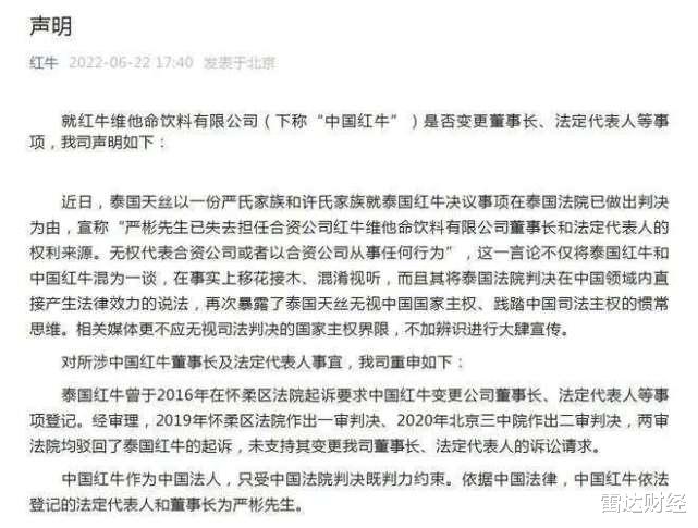 对此,“红牛”微信号日前发布回应称,中国红牛作为中国法人,只受中国法院判决既判力约束。依据中国法律,中国红牛依法登记的法定代表人和董事长为严彬。