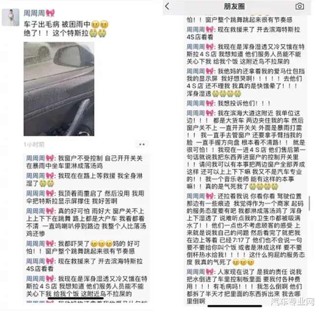 6月29日,某知名动漫博主在社交平台上分享了一条自己朋友圈里关于特斯拉的视频,视频里呈现出“屋外大雨,屋内中雨”的景象。随后,该博主在评论区又附上了一张朋友圈车主截图。