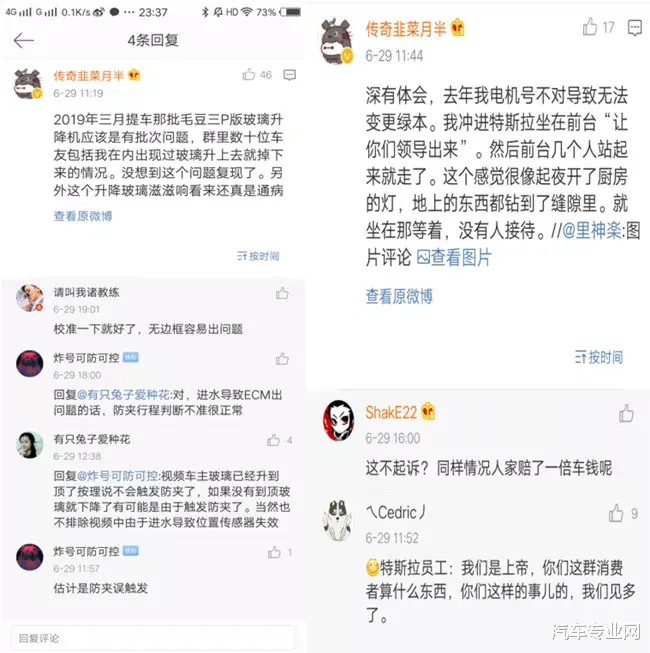 有多位网友用戏谑的腔调评论了此事,其中有位网友称这是特斯拉在加强对车主的训练,主要内容是训练车主在极端天气下的生存能力,对未来天气变化未雨绸缪。《汽车专业网》编辑注意到,讨论区中有位视频博主称这应该是2019年3月所提Model 3 P版玻璃升降机的批次问题,他强调群里有数十位车主包括自己都出现过玻璃升上去就掉下来的情况,同时该网友还指出特斯拉升降玻璃滋滋响的通病。与此同时,该博主也对特斯拉售后的服务态度表示不满。