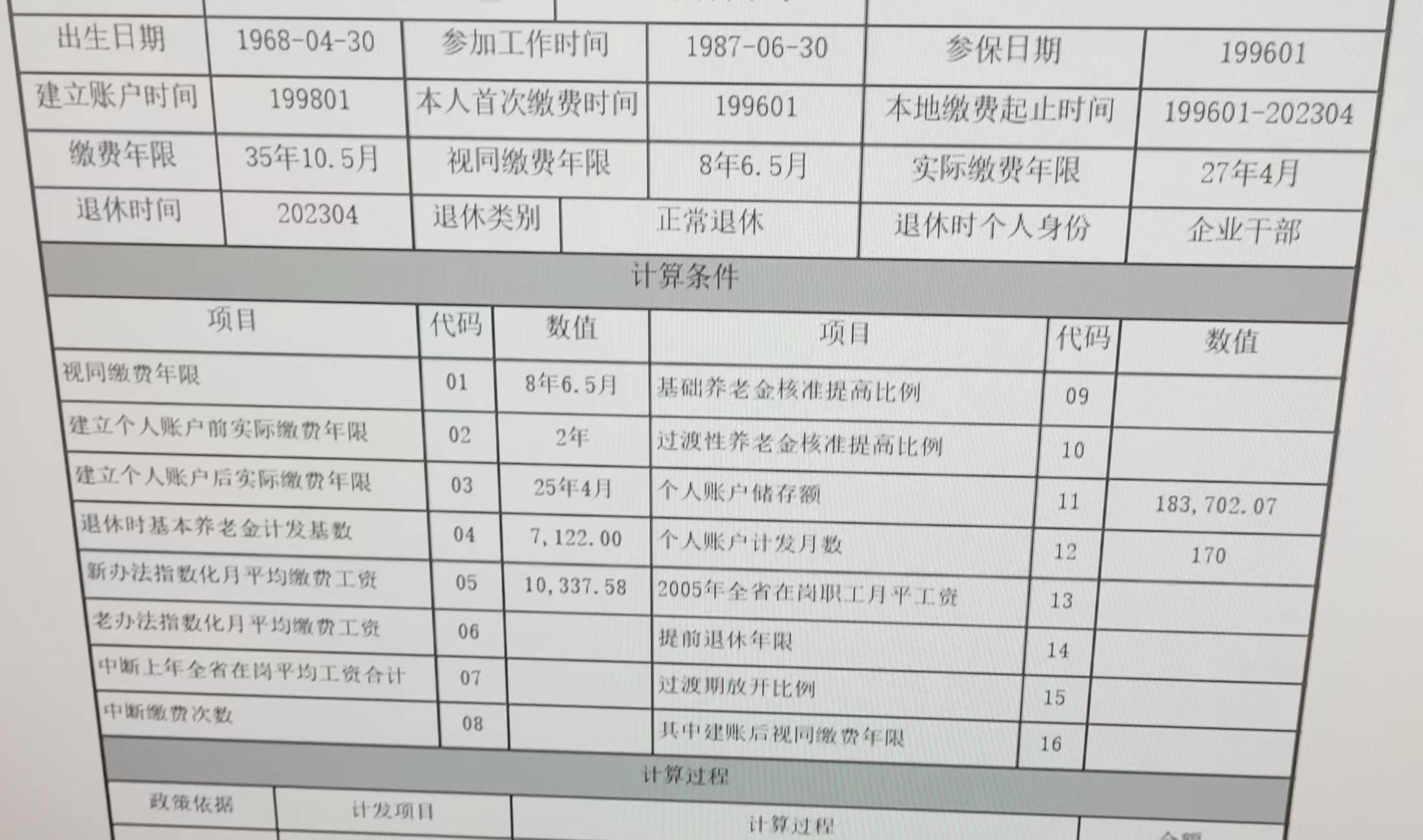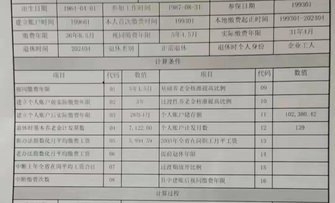 这是24年4月退休的河北核定表,男,60岁,工龄36年8.5个月,指数0.8417。