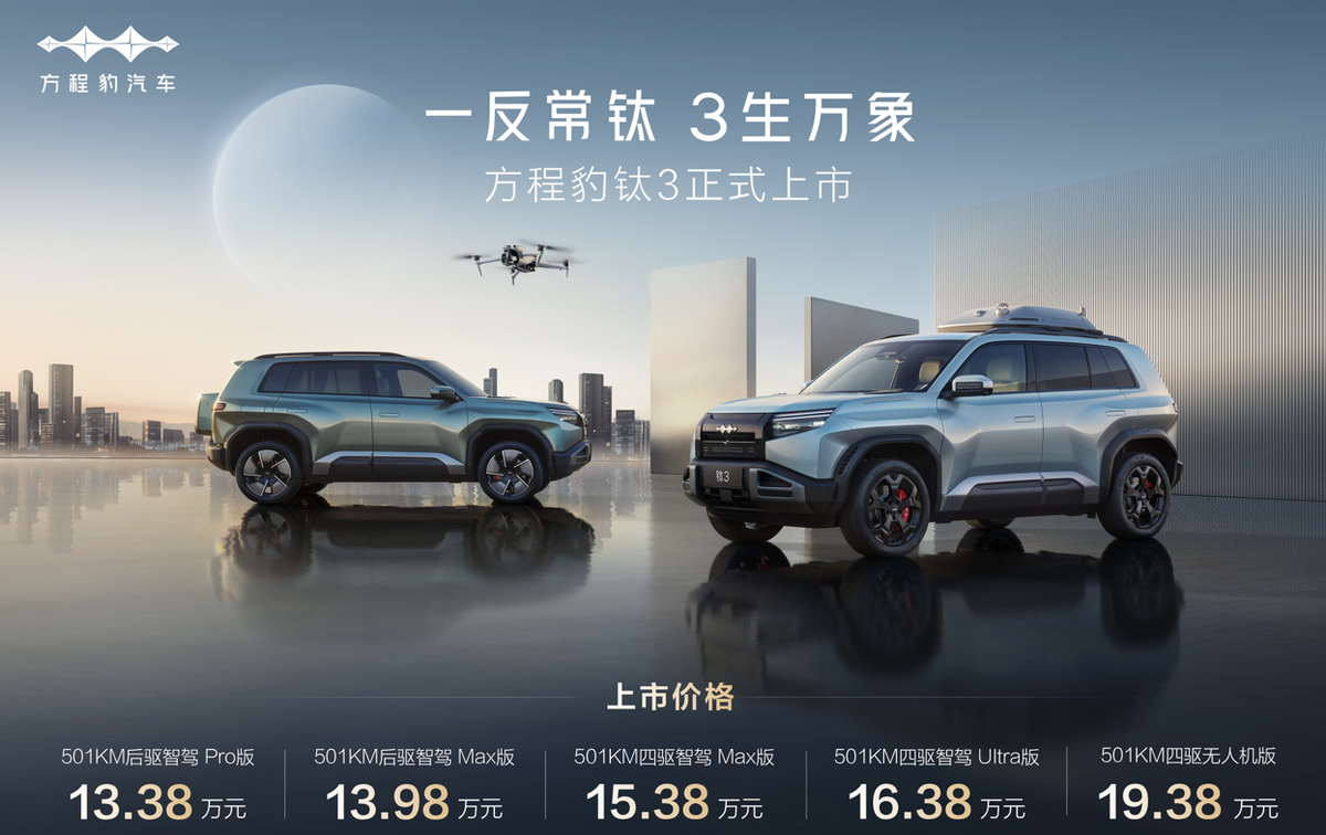 近日方程豹钛3迎来了上市,共5个版本,官方指导价13.38-19.38万元。这台车从外观到空间,从配置到用车方式,都完全不同于同级别的车型。