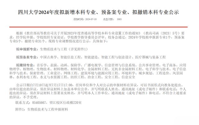 四川大学教务处于 7 月份在官方网站发布了《四川大学 2024 年度拟新增本科专业、预备案专业、拟撤销本科专业公示》。其中,拟申报新专业 1 个,预备案专业 5 个,撤销专业 31 个。这 31 个被撤销的专业包括音乐学、表演、动画、保险学、广播电视学、信息管理与信息系统、公共事业管理、电子商务、应用物理学等。