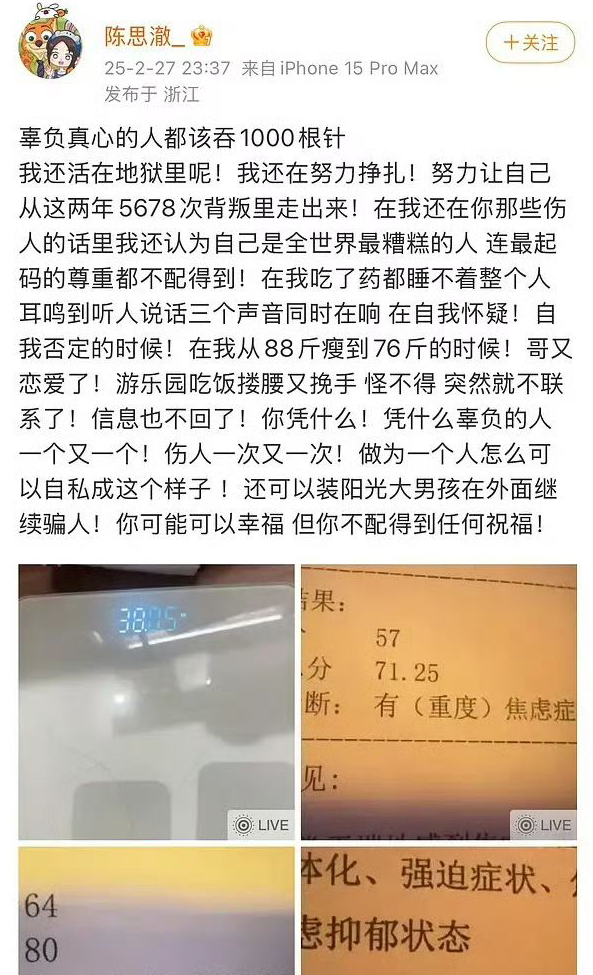 不过还未等到网友们扒出郑业成女友的身份,演员陈思澈就在微博发长文自爆了自己被男友劈腿导致抑郁的经历,陈思澈称自己如今还活在地狱里,还在努力挣扎,让自己从多次背叛中走出来,凭什么辜负真心的人就能得到幸福,还可以装阳光大男孩继续在外面骗人,这样自私的人就该吞1000根针。