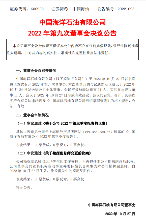 中国海洋石油有限公司发布2022年第九次董事会决议公告,审议通过《关于勘探副总师变更的议案》。公司勘探副总师邓运华先生因工作安排,不再担任公司勘探副总师职务,公司董事会同意其职务变动事宜并委任徐长贵先生为公司勘探副总师,自2022年10月27日生效。