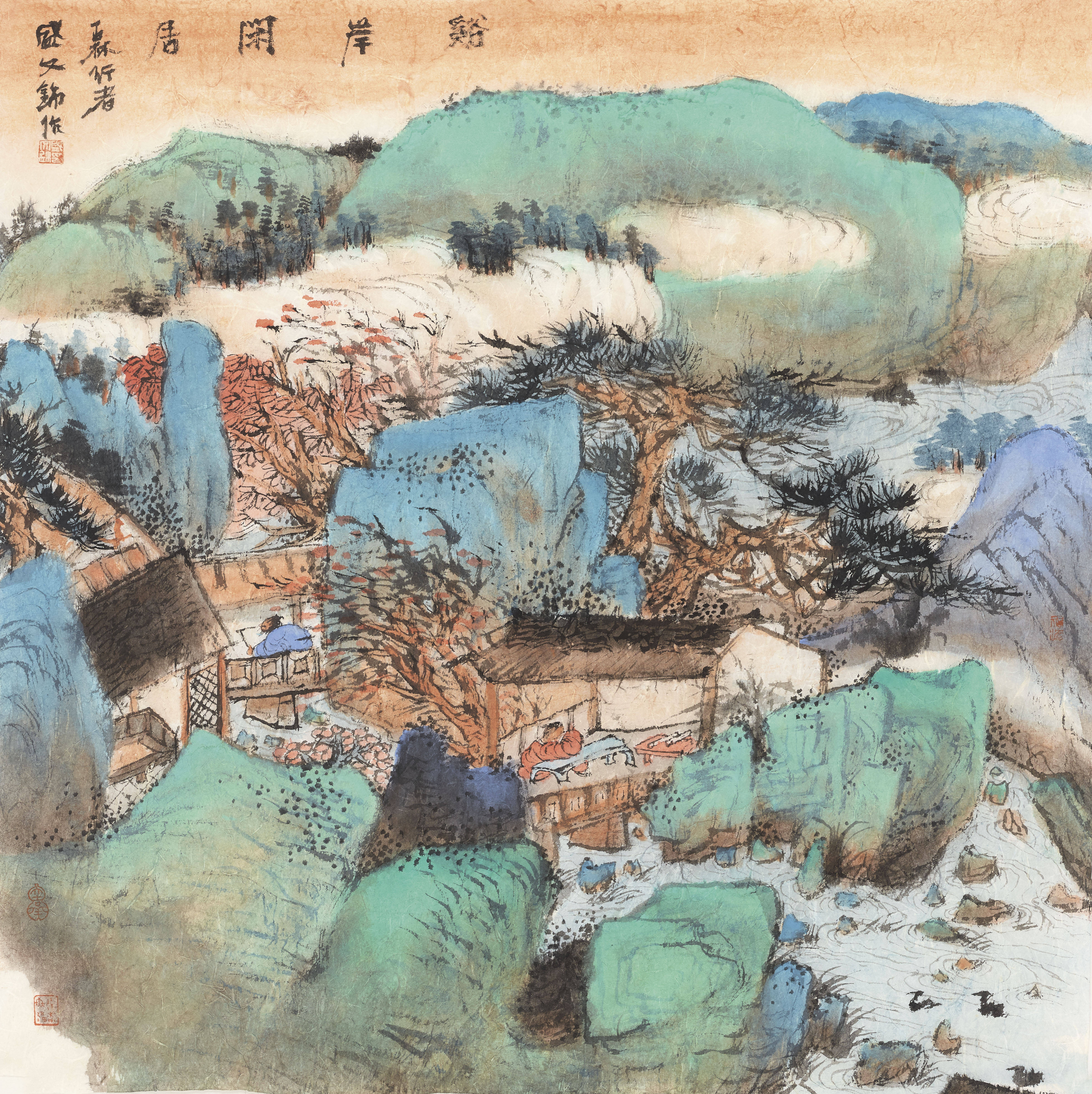盛文锦的青绿山水,首先令人惊叹的是其色彩的运用。那一抹抹浓郁的青绿,仿佛是大自然最慷慨的馈赠,被画家巧妙地捕捉并呈现在画布之上。绿色,生机盎然,象征着大地的蓬勃活力;青色,深邃悠远,寓意着天空的广袤无垠。两种色彩相互映衬,和谐共生,营造出一种如梦如幻的意境。或峰峦叠翠,云雾缭绕,似仙宫之境;或江水悠悠,波光粼粼,如人间胜景。每一处色彩的过渡都自然流畅,毫无突兀之感,展现了画家高超的色彩驾驭能力。