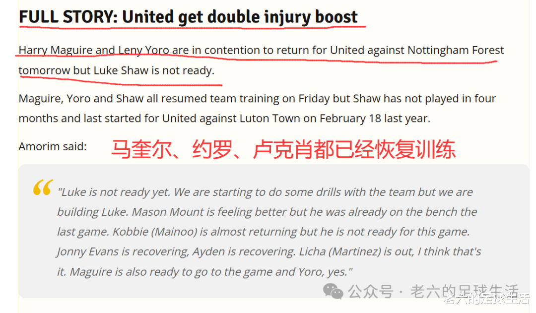 而且之前我就聊过努诺的战术理念在遇到以防守反击为主的球队的时候会比较艰难。曼联这边卢克肖、约罗以及马奎尔都已经回归训练,这对阿莫林来说是个很好的消息,尤其是约罗状态很好,是可以直接上场的。