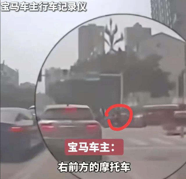 逮着宝马车车主一顿吵,但是从宝马车行车记录仪显示摩托车因为某种原因,太靠前了。