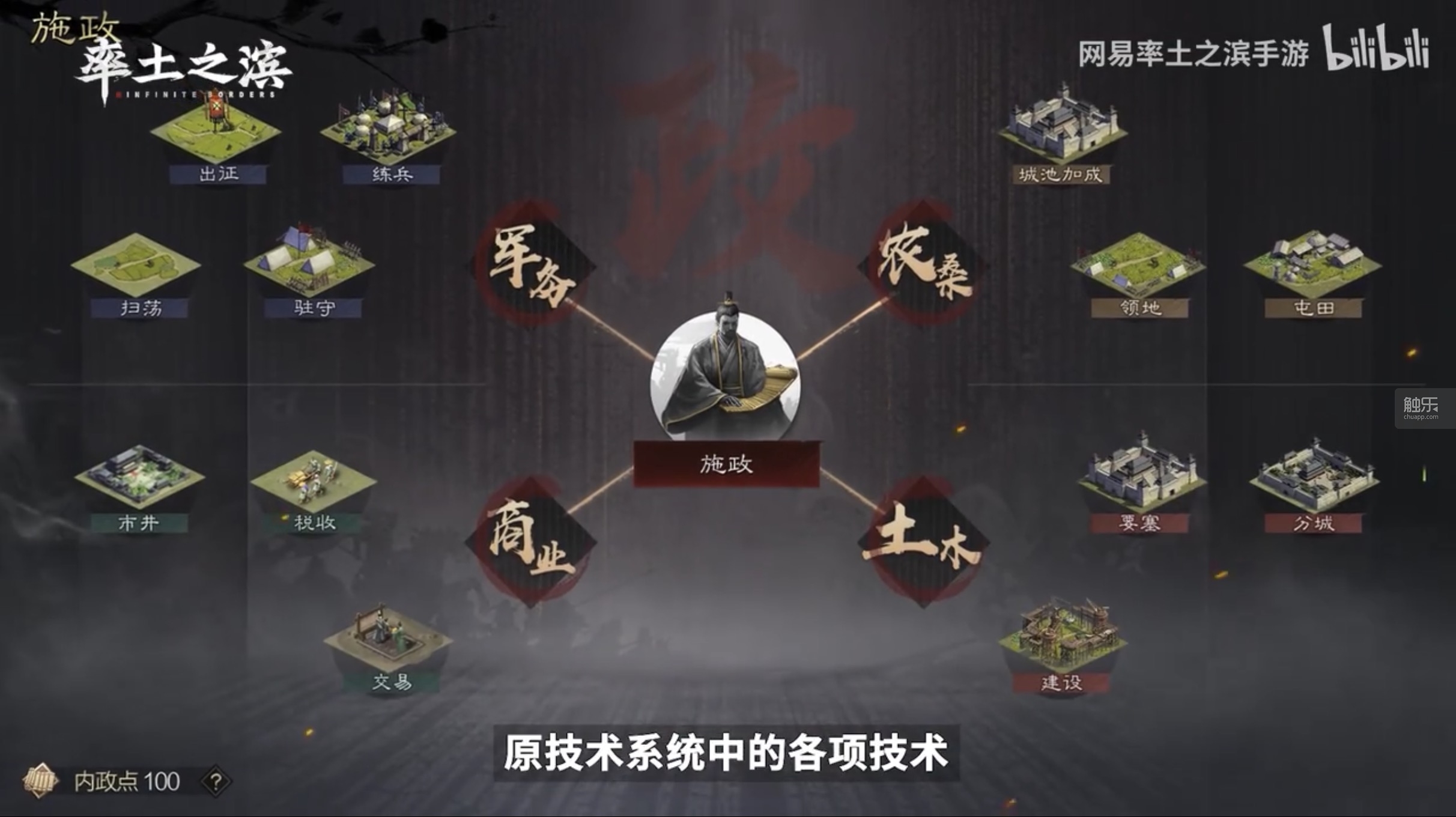 2021年,《率土之滨》更新了架构清晰的内政系统。参考古代士、农、工、商4种职业类别,将“内政”成体系地划分为军务、农桑、土木、商业4条路线,并为武将增加了政务能力,以对应玩家在不同时期对不同流派的需求。在内政系统的影响下,玩家可采取的流派方向更加清晰,通过差异化的搭配,能够完成同时符合自身喜好和同盟需求的成就。