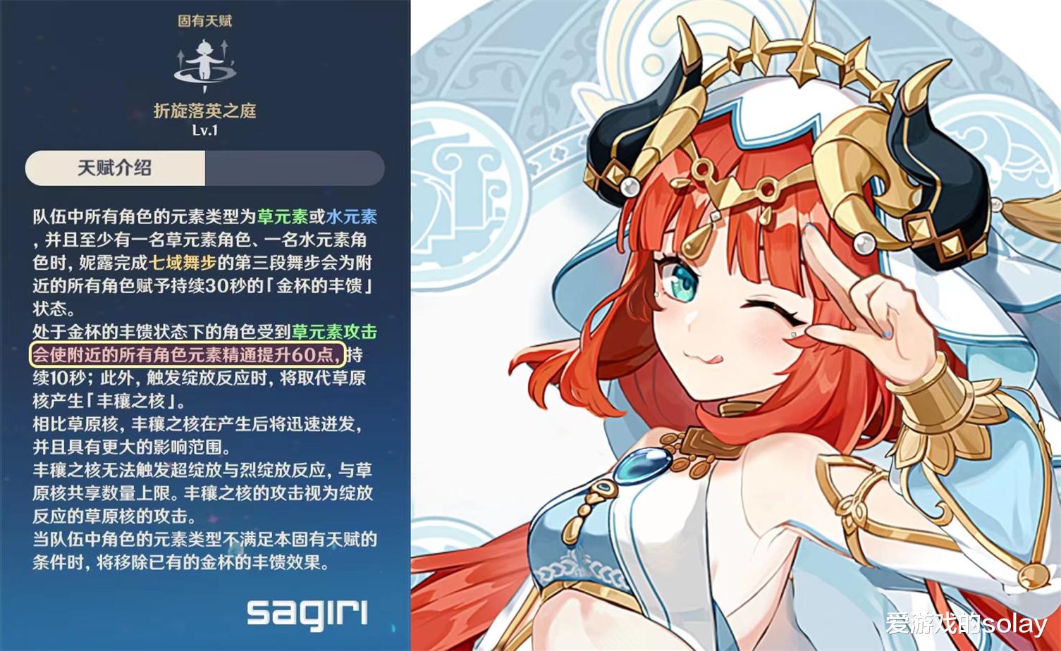 3.1测试服迎来了第一轮更新,三位新角色均有不同程度的改动。先说妮露,她的改动应该是三人中幅度最小的,天赋“折旋落英之庭”元素精通提升60点的效果前新增了“会使附近所有角色提升”的描述。看似是从只能妮露单人享受变为了全队加成,联机的队友也能享受到。但根据Blank的说法,其实一开始妮露天赋就有全队加成精通的效果,只不过文案没有表述清楚;如今仅仅是修改了天赋描述,效果不变。