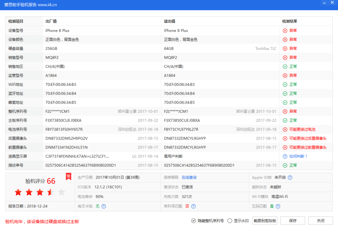 假如爱思助手读取硬盘序列号后再来和你后来安装的部件序列号不同,这个时候就是红色低分警告,打开爱思助手的验机报告图片,左边是爱思在硬盘里面的读取中,右边是读取到实际部件的序列号。