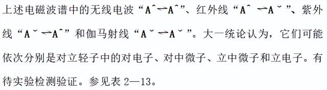 很明显,对立两方面分布在可见光谱的左右两边,中间的可见光则是它们的对立统一。存在对立两极,左端无线电长波是对极,几乎就是纯波;右端伽马射线是立极,几乎就是大粒光子。参见表2—12。