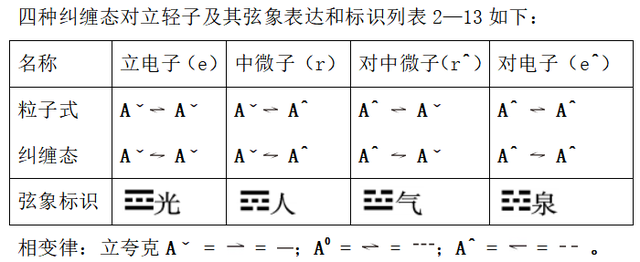 相比较而言,光子的二重纠缠态和偏振态的结构配对子是相同的,都是由两个中夸克组成,所不同的是中间传递相互作用的关系子是不同的。纠缠态的关系子是由中夸克相变生成的左右旋共振子承担,偏振态的关系子是由立夸克相变生成的作用力子或对夸克相变生成的反作用力子来承担。参见表2—11。