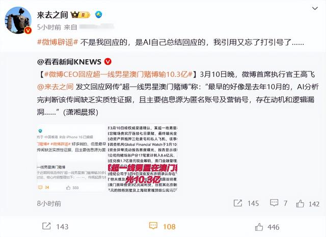 原本以为这条消息是王高飞自己发的,没想到3月11日,他又发文辟谣说不是自己回应的,是AI自己总结回应的...