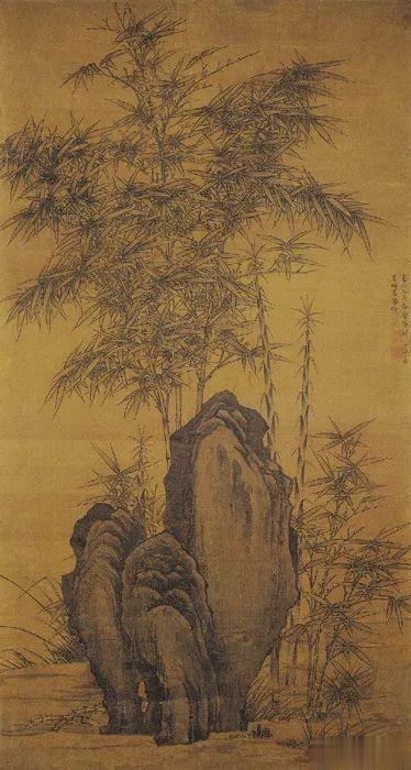元代刘秉谦的《竹石图》轴, 全图以墨色和汁绿为主,绘湖石及掩映石后的双勾竹篁。结构灵秀多姿,勾染精妙利落,是画家传世孤本精品。署款“至正乙未春寿阳刘秉谦为克明宪掾作”。钤“秉谦”、“刘氏之益”、“冰雪相看”三印。“至正乙未”为至正十五年,即公元1355年。