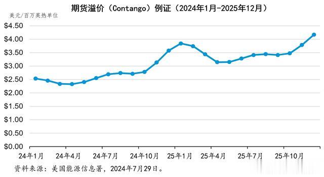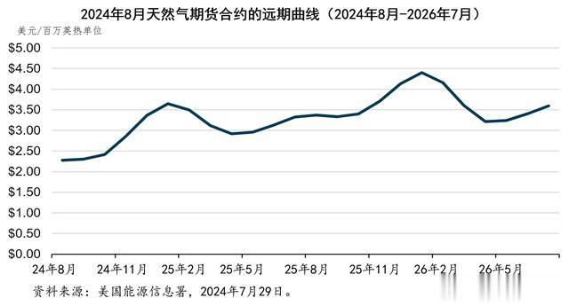 2024年7月底,世界天然气期货市场处于期货溢价的状态。市场的数据显示,2024年12月至2025年3月的冬季,天然气的价格将上涨,而2025年至2026年冬天将会进一步上涨(+82%)。总体而言,这一期货溢价,反映了市场对这一时期天然气需求超过天然气供应的预期。美国能源信息署认为,由于美国国内天然气产量增长的放缓,随着新的液化天然气设施投入运营,需求将增加,将会导致市场上天然气的供应过剩低于五年(2019-2023年)的平均水平。
