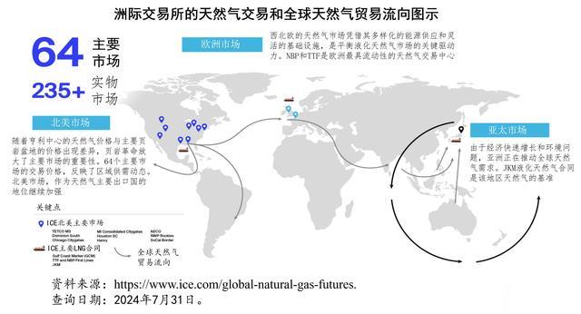 北美市场,以美国路易斯安那州的亨利中心(Henry Hub)作为交易枢纽与期货交割地,主要得利于该地邻近油气产区、出海口,是全美州际/州内天然气管线系统交汇处,表现的是世界最大天然气产地和消费地的供需特征;欧洲市场,即以英国的国家平衡点(National Balancing Point, NBP)与荷兰的所有权转让系统(Title Transfer Facility,TTF)作为交易中心,表现的是本区天然气生产、消费加上进口液化天然气混合的市场特征,目前TTF的重要性不断提升,而NBP则日益下降;东北亚市场,是全球液化天然气的主要进口和消费地,跨国管道运输量较少,以普氏日韩指数(Japan / Korea Marker)当作液化天然气的报价基准。