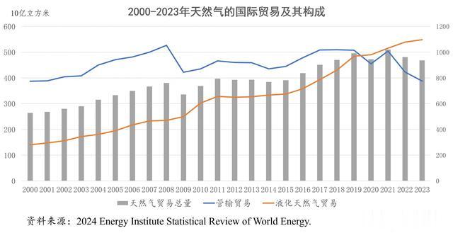 根据英国能源研究所发布的2024年版《世界能源统计评论》的数据,2020年,液化天然气的全球贸易量首次超过了管输天然气的贸易量,当年全球液化天然气的贸易总量为4900亿立方米,而管输天然气的贸易总量为4547亿立方米。因此,2020年,可以称之为天然气贸易全球化的元年。