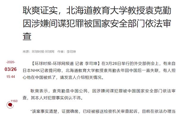 信息来源:环球网,2020年3月26日,耿爽证实,北海道教育大学教授袁克勤因涉嫌间谍犯罪被国家安全部门依法审查