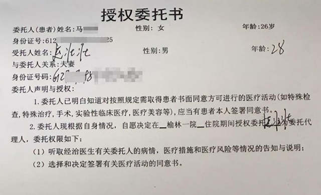 在家属劝说下,马茸茸被说服并签署了《知情同意书》和《授权委托书》,授权丈夫在关键时刻决定生产方案。