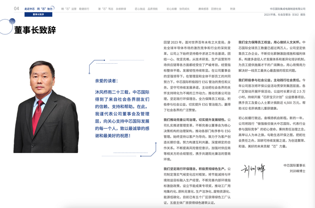 中芯国际董事长刘训峰博士在《报告》的致辞中表示:回望2023年,面对世界百年未有之大变局,身处全球半导体市场的激烈竞争和行业的深刻变革,公司上下始终坚持稳中求进工作总基调,团结一心、攻坚克难,从技术研发、生产运营到市场供应链等各方面都经受住了严峻考验,经营指标整体平稳,发展韧性持续彰显。在公司董事会的坚强领导下,在管理层和全体干部员工的共同努力下,中芯国际积极践行ESG管治的责任和义务,坚守可持续发展承诺,主动把社会各界的关怀支持转化为不竭的工作动力,推动完善公司治理,坚定践行环保理念,全力保障员工权益,积极参与社会公益,切实提升ESG管治能力,赢得了社会各界的广泛赞誉。