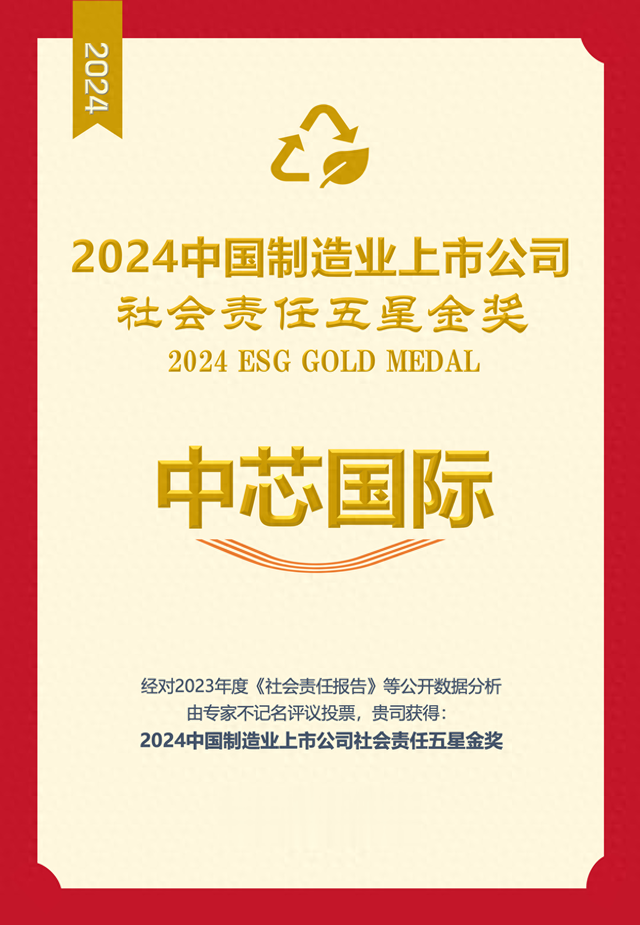 (中芯国际获得“2024中国制造业上市公司社会责任五星金奖”荣誉证书)