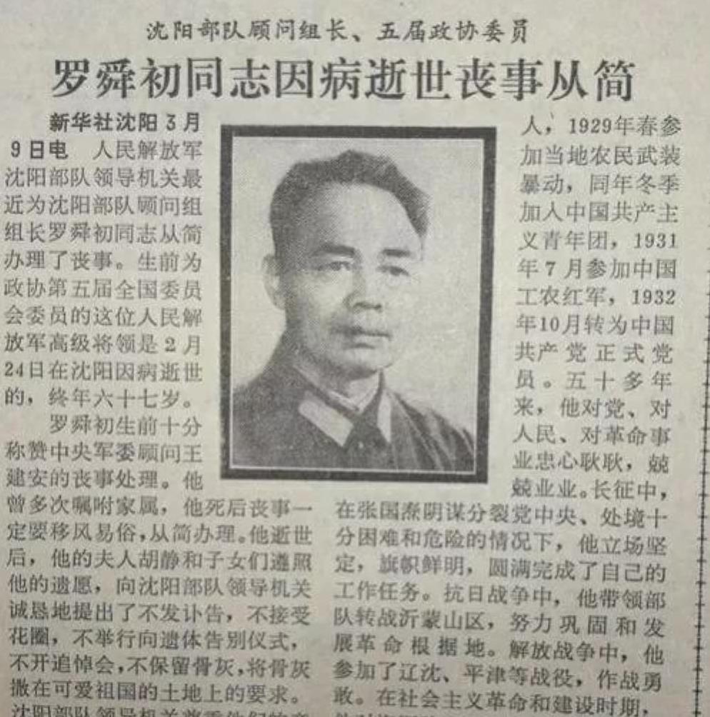 报纸报道罗舜初去世罗舜初将军永垂不朽!