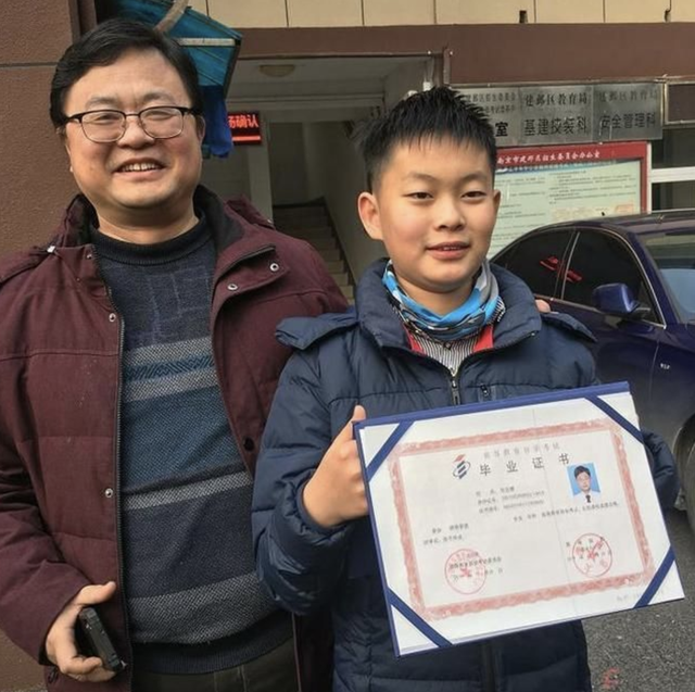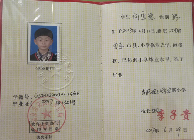 在他8岁那年,顺利通过小升初的考试,从南京理工大学实验小学毕业。