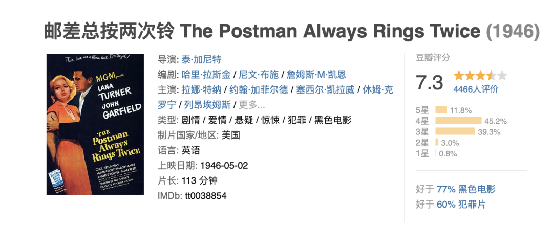 它就是改编自美国作家詹姆斯·凯恩创作于1934年的长篇小说《邮差总按两次铃》。