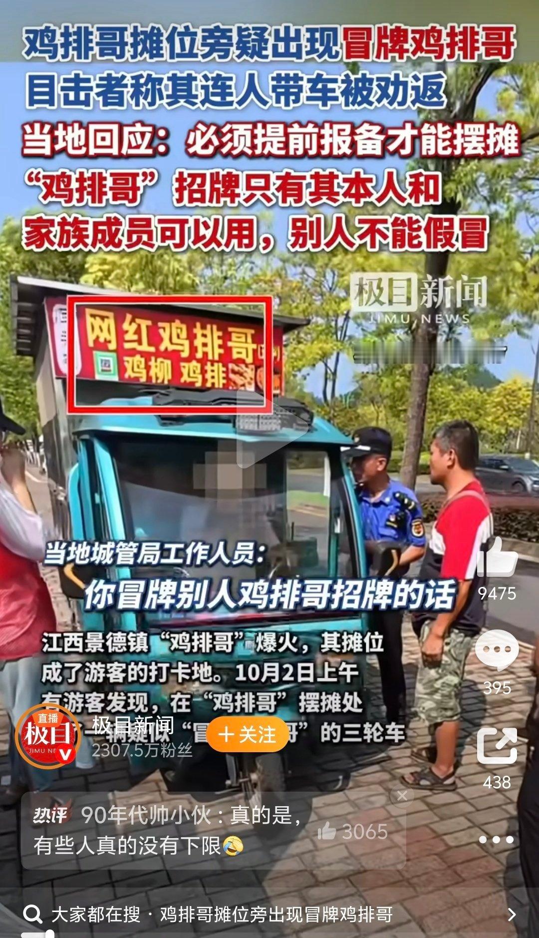 冒牌鸡排哥连人带车被劝返,真是人怕出名,冒牌鸡排哥都出来了。互联网每隔一段时间,