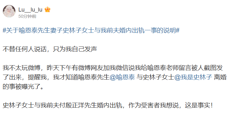 近日, 与妻子史林子婚变风波引热议。刚刚,他发文回应称因为孩子忍辱多年,“被离婚