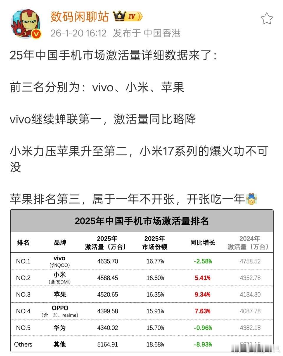 怎么还有一个“2025中国手机市场激活量排名”?排名前五按照顺序分别是vivo、