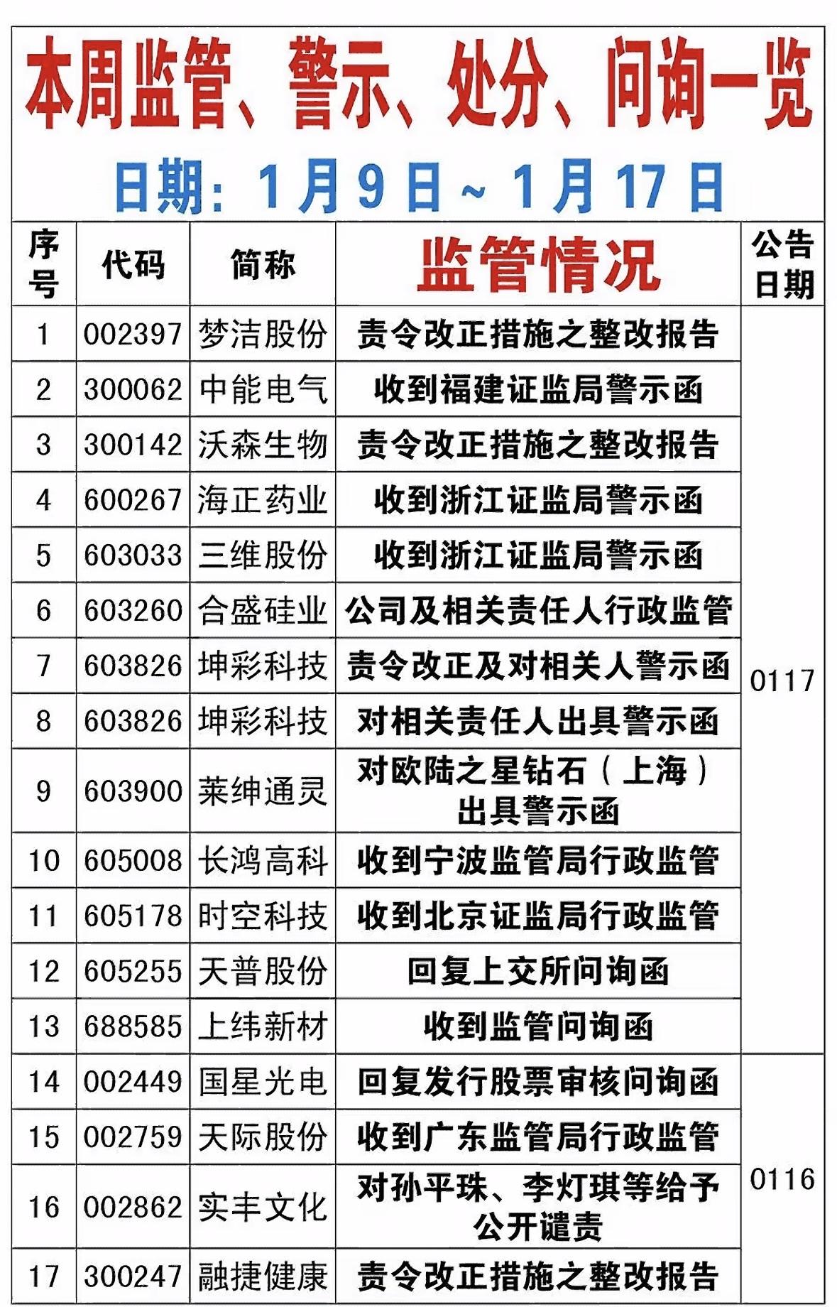 "本周多家上市公司遭监管警示,涉及整改、问询及处分,涵盖多地证监局行政措施。"