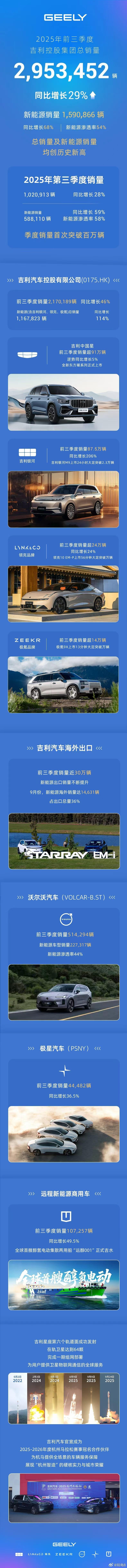 吉利控股集团2025年前三季度总销量2,953,452辆,同比增长29%;新能源