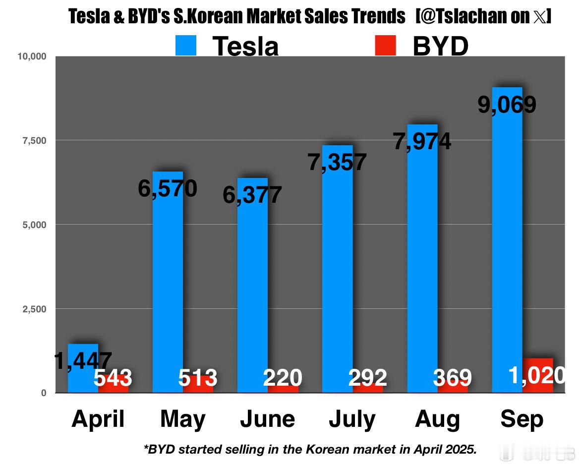 【比亚迪特斯拉在韩国销量】这特斯拉和比亚迪在韩国9月份的车辆销售数据(两个品牌都
