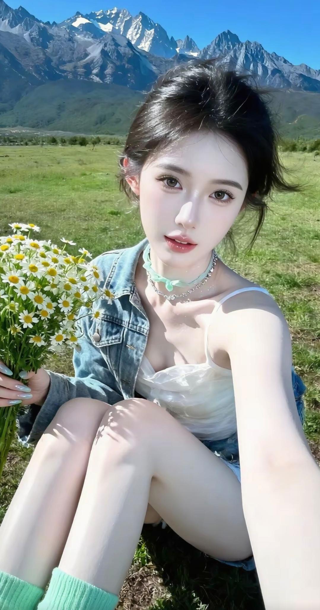 风把衬衫角掀起来,她指尖抵在唇上,像藏住了半口草原的风。车窗外是漫到天底的绿,白